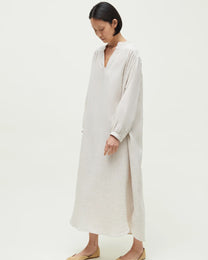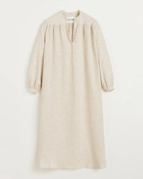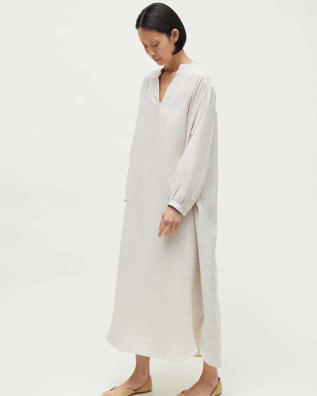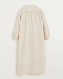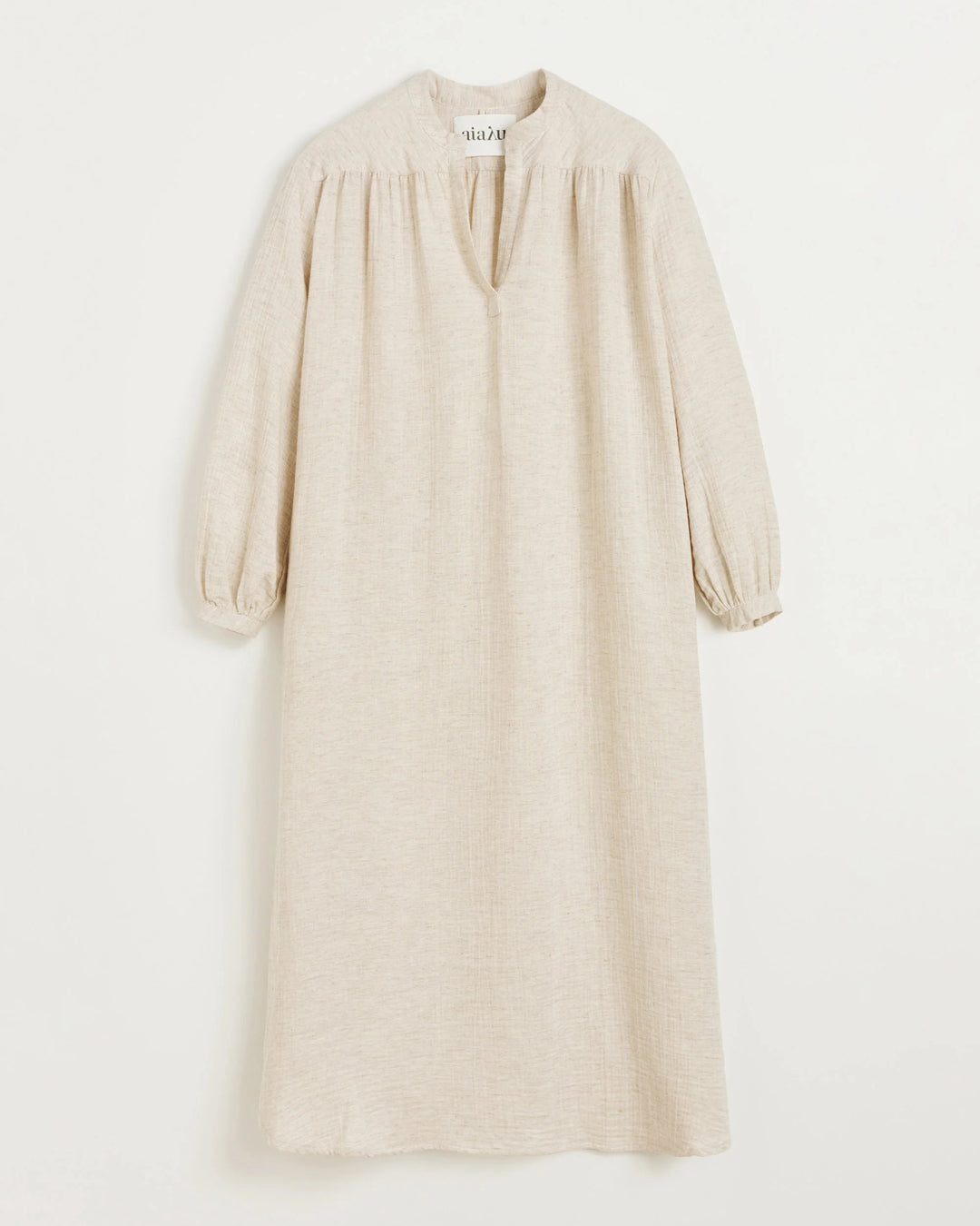 A soft, long dress made from undyed, natural fibres, creating a refined mélange effect. The dress is designed with an open neckline, a curved hemline, and delicate ruched details at the yoke and sleeves, that together form a voluminous silhouette.