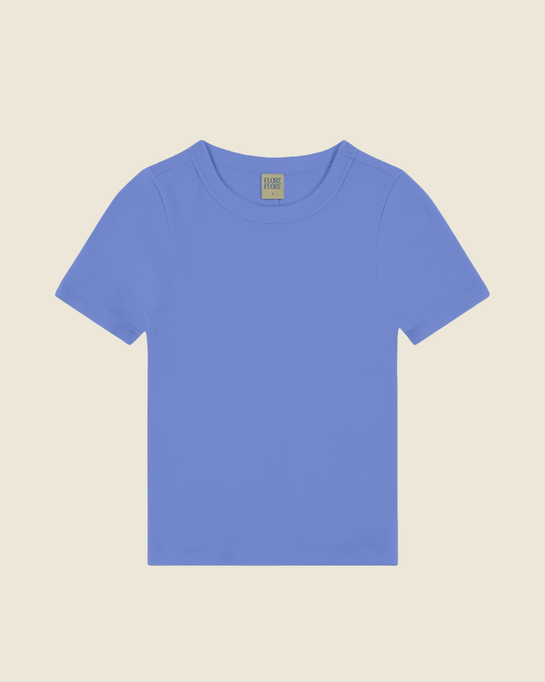 A fitted tee with a lengthened short sleeve, round bindings, and a double-stitched cut-off seam on the back. Made from soft, medium-weight organic cotton rib.
