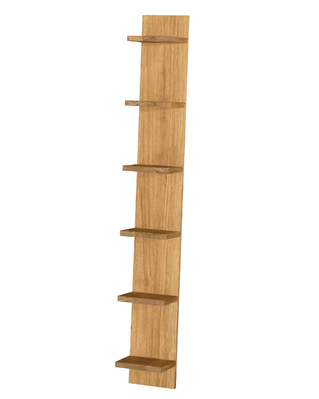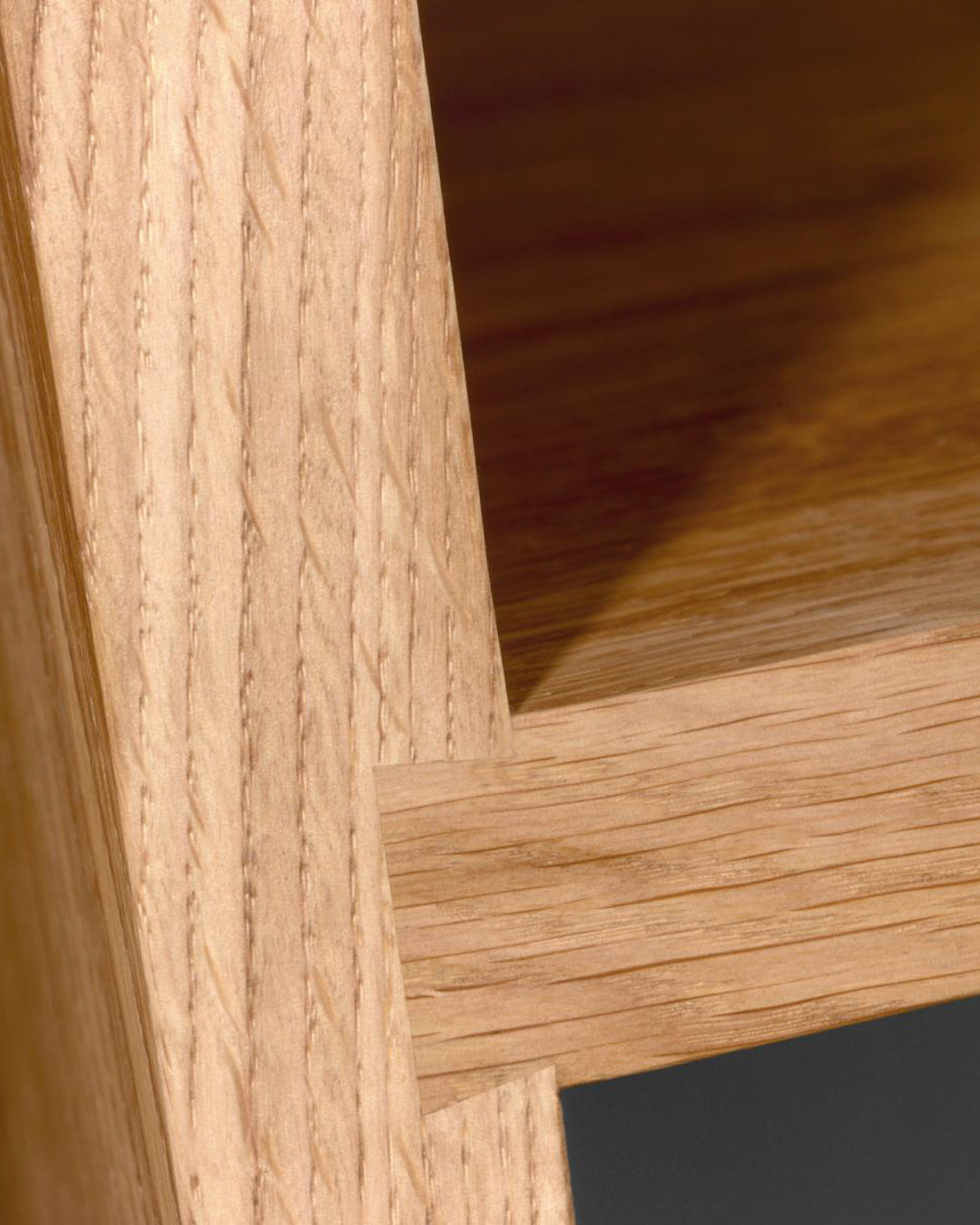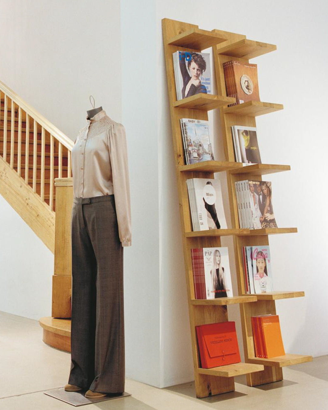 The distinct solid wood shelf MATE is leaned against the wall, expressing a casual approach. The shelves are fastened to the backboard using a classic dovetail joint; this traditional detail lends the unit the necessary stability while reflecting an overall modern solution for shelving.