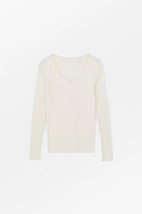This slim fit long-sleeved top is knitted in 100% organic cotton pointelle. A delicate lace trim follows the open V-neckline and the cuffs and hem have baby lock edges.