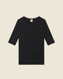 A lengthened t-shirt with lengthened short sleeves, made from lightweight transparent organic cotton 1 x 1 rib. Layer underneath or wear on its own during warmer days.