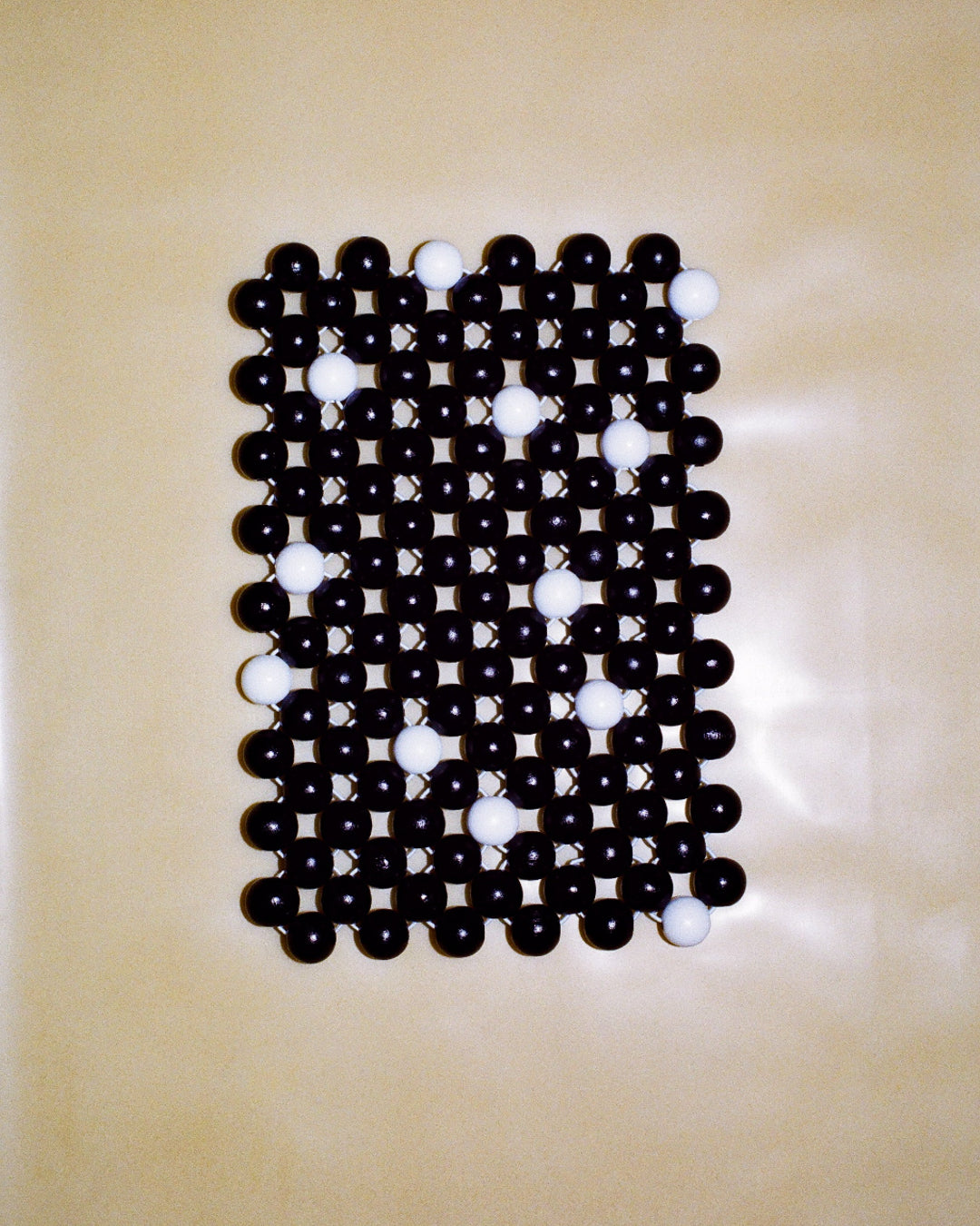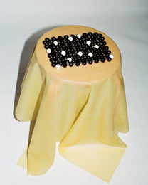 Coaster made from black and white wooden beads and black elastic cord. The coaster is lightweight and heat-resistant. Versatile in the kitchen or on the coffee table. Handmade in the Netherlands.