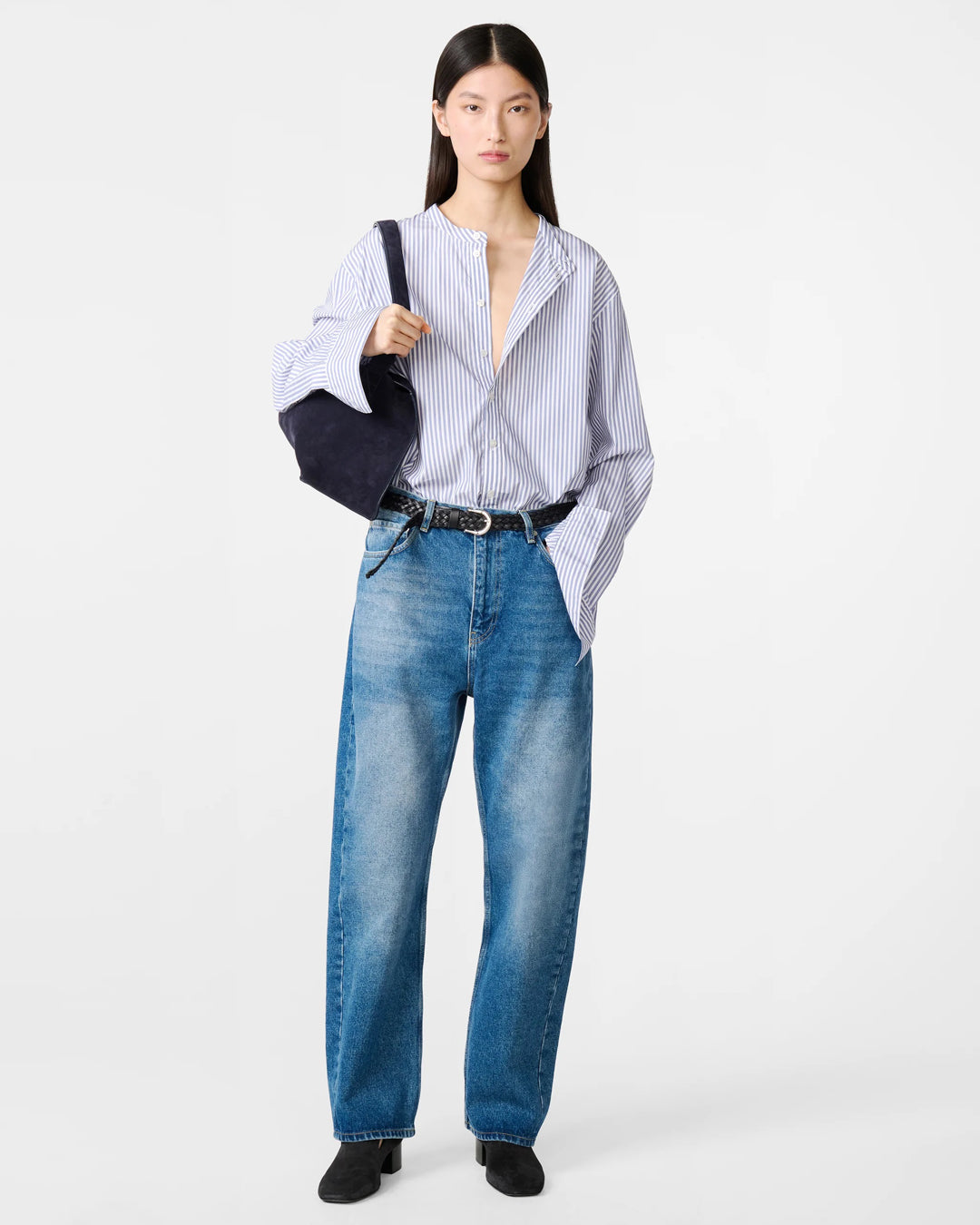 The Denjo jeans have a wide leg that’s softly shaped with a forward seam, creating an ergonomic fit that feels relaxed and wearable. This pair is cut from denim woven with regenerative cotton in a rich washed-indigo shade.