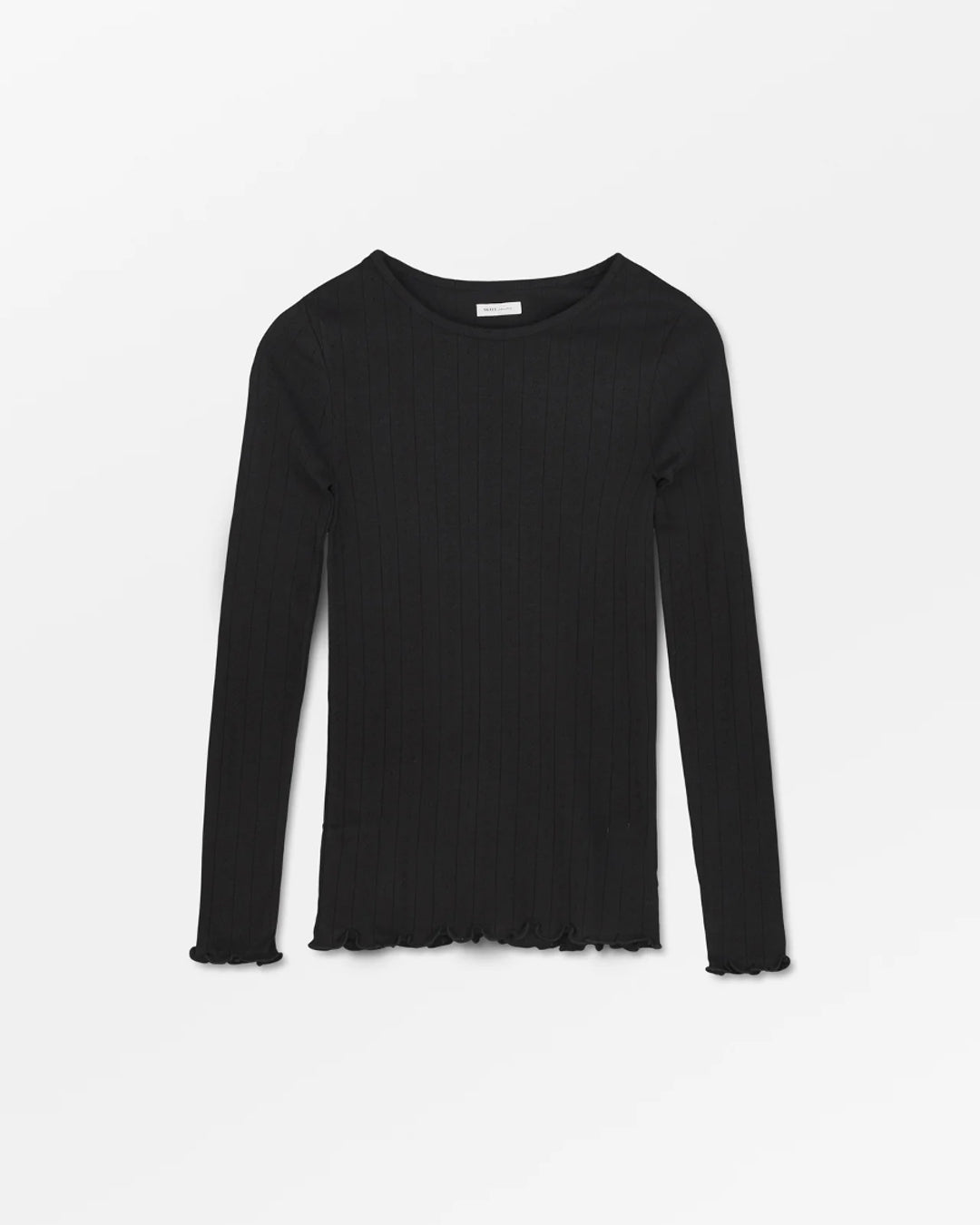 Edie blouse is a cotton jersey pointelle blouse. It has a classic fit with long sleeves and baby lock edges.