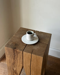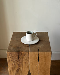 Each piece is wheel-thrown and turned by hand using coarse, high-fired sculptural stoneware. Finished with a shiny white glaze on the exterior and a deep navy glaze on the interior, creating the illusion of a filled espresso cup even when empty.