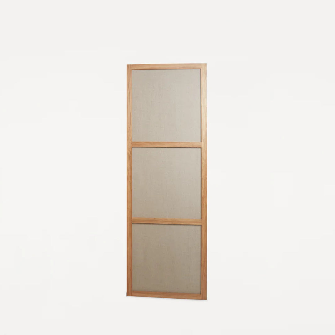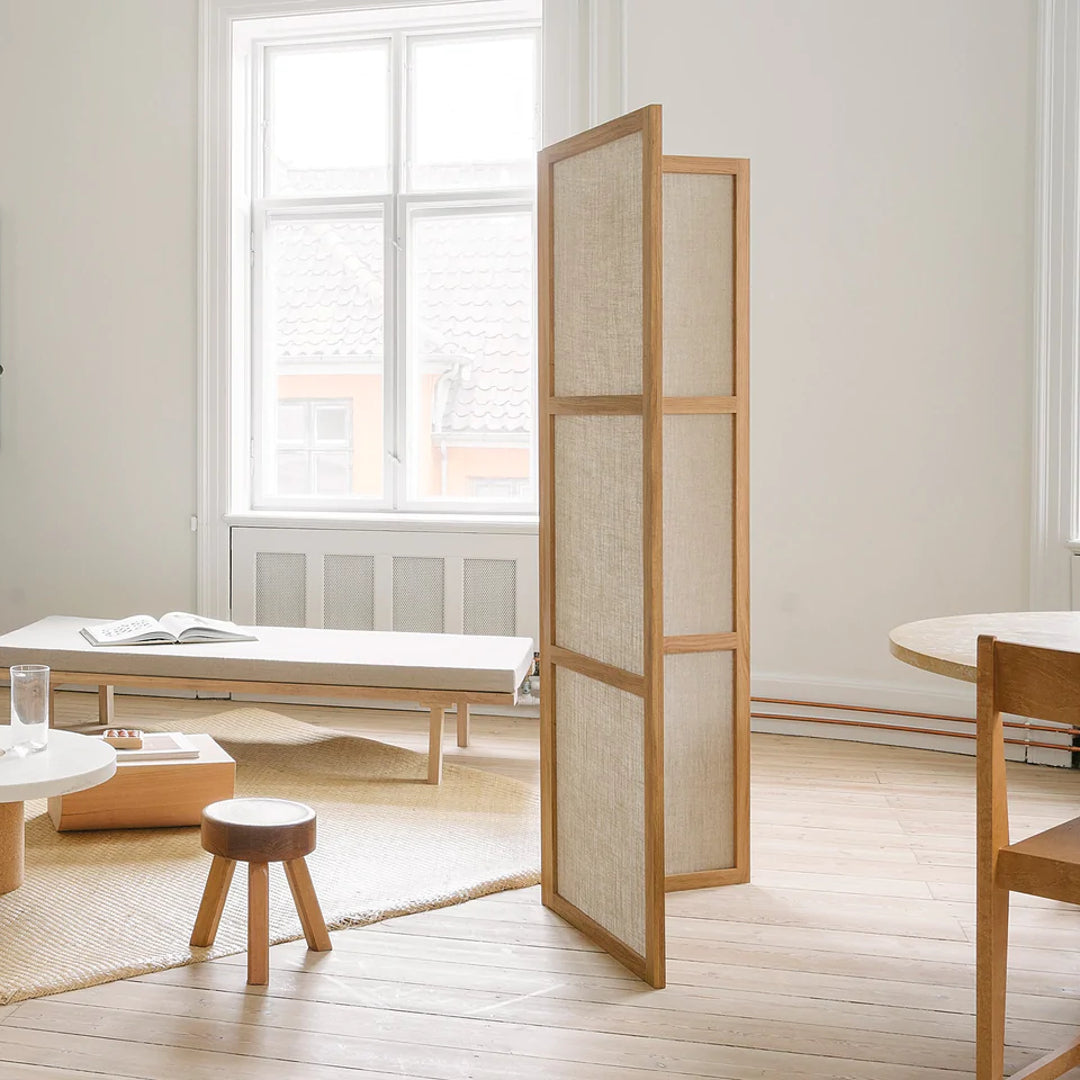 The Frame Room Divider is designed to be a discrete and subtle way of separating any room. Whether you require some privacy, a place for guests to relax, or want to add a spatial element to your home, the Room Divider maintains the same experience as the room and allows for translucency. The free-standing pieces are composed of natural oak and canvas and are held together with strong magnets to form a simple aesthetic and for practicality in moving.