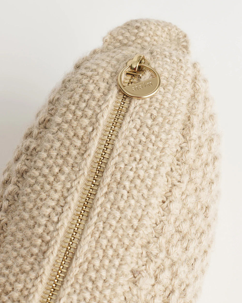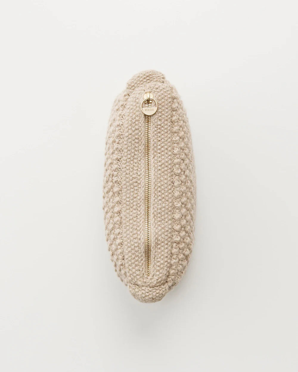 A spacious, hand-knitted clutch made from heavy highland wool. The bag is lined with practical details such as an interior pocket and zip closures. Designed with a beautiful mega pearl pattern that adds a distinctive touch.