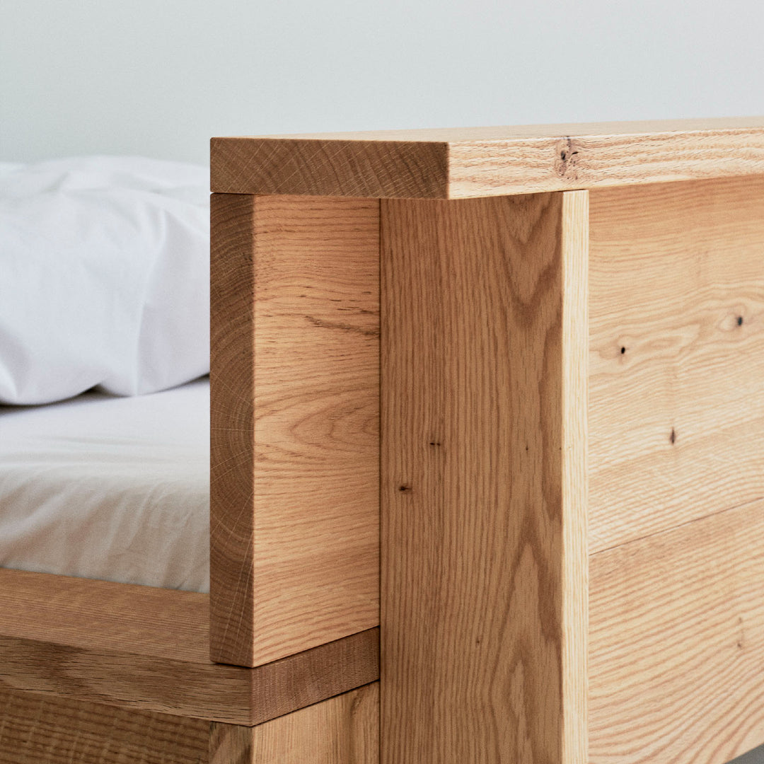 The Hem Bed Frame is a sculptural centerpiece for the bedroom, masterfully crafted from solid red oak.