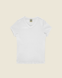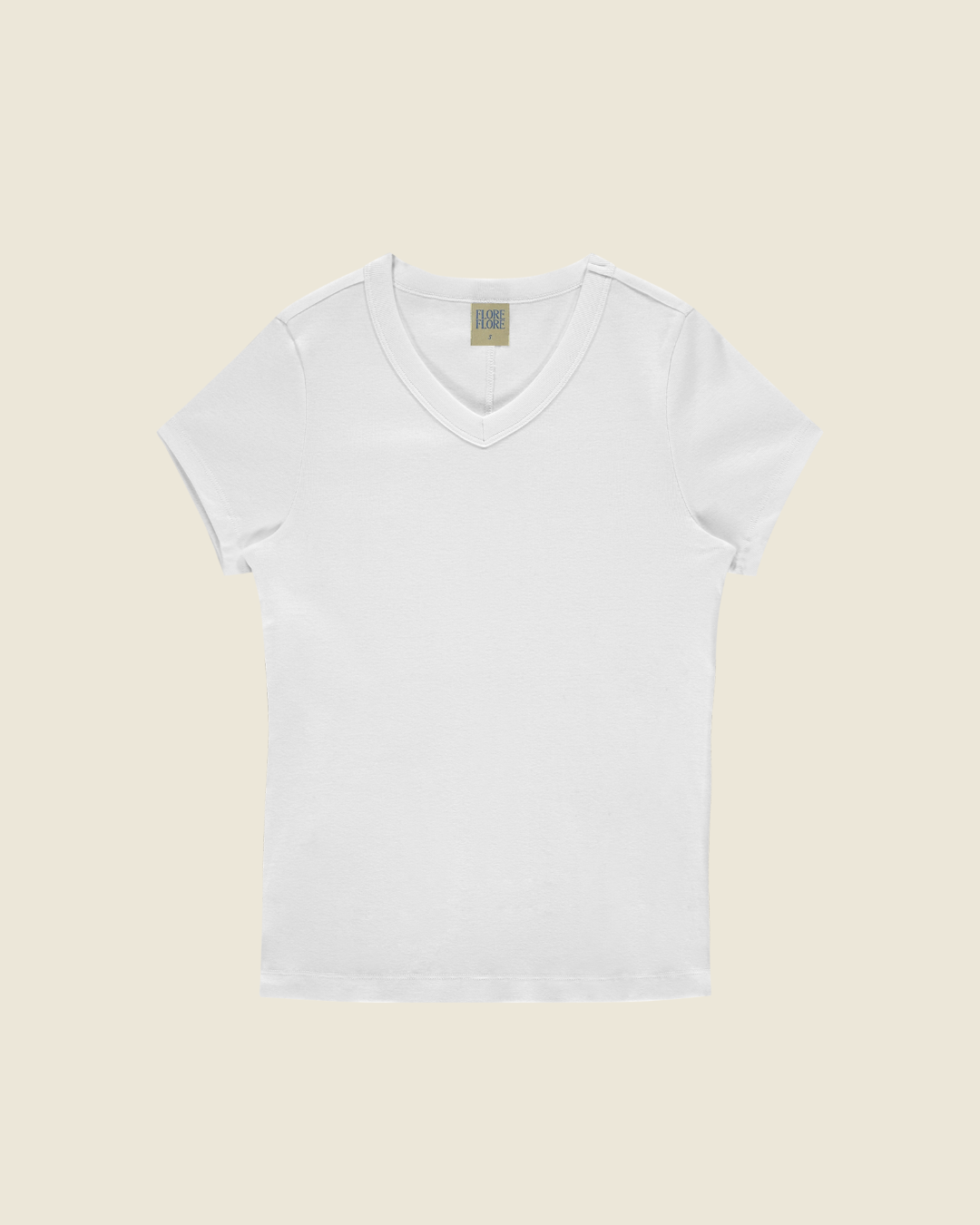A short-sleeved baby tee with a V-neck and cut-off seam on the back, made from medium-weight organic cotton rib. Ideal for layering with Flore Flore's Esmé Tank.