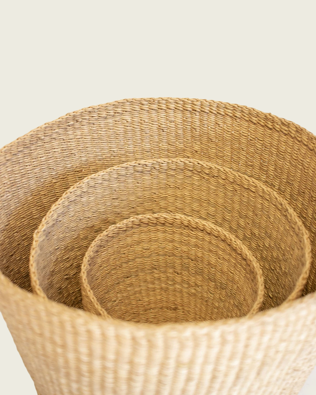 Graduated baskets, handwoven from elephant grass in the Bolgatanga region of Northern Ghana by skilled traditional weavers. Their sculptural form and natural texture make them a versatile addition to any space.