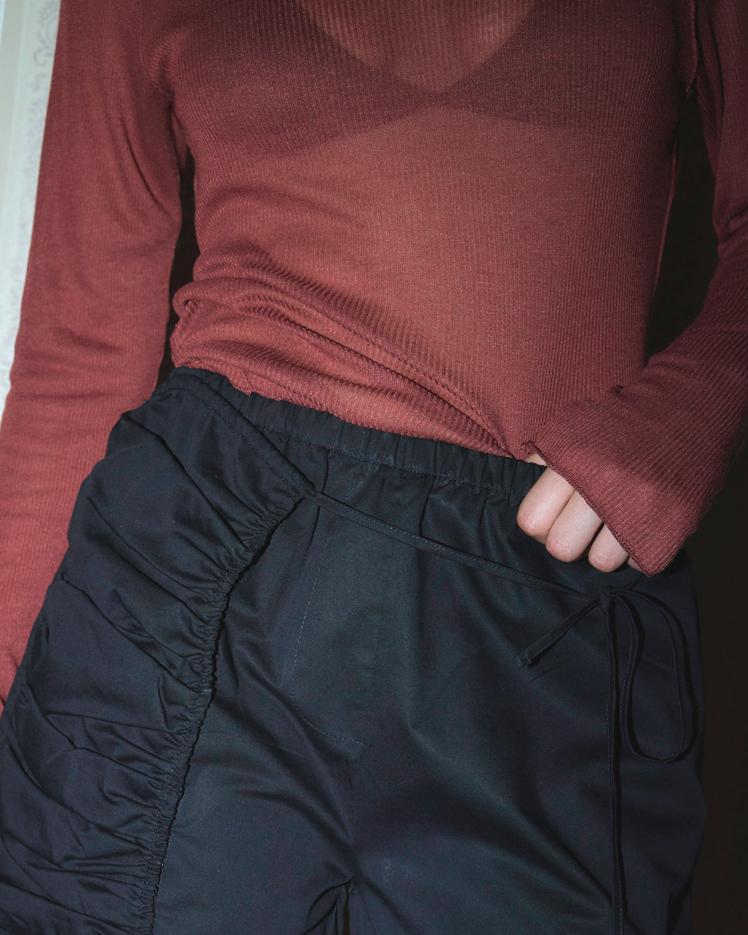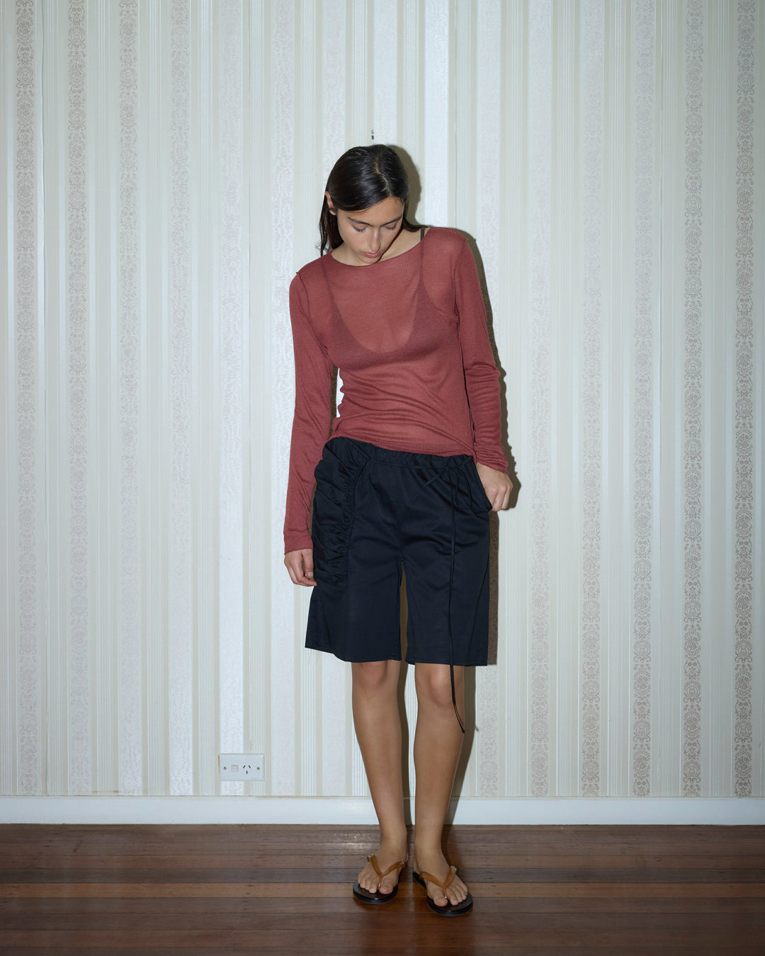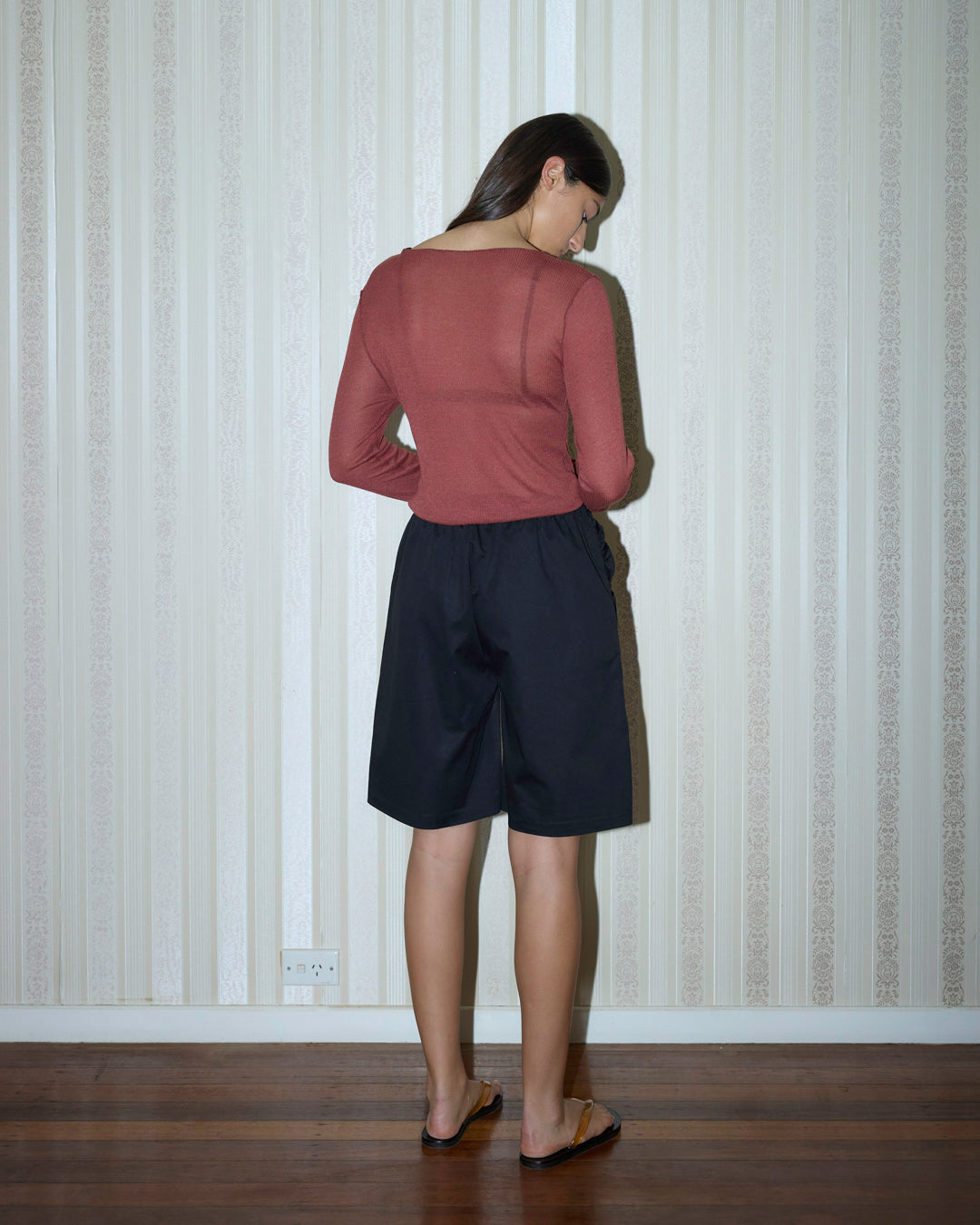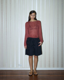 A sheer fine knit long-sleeved top with exposed seams and tag, featuring baby locked finishes and a relaxed fit.