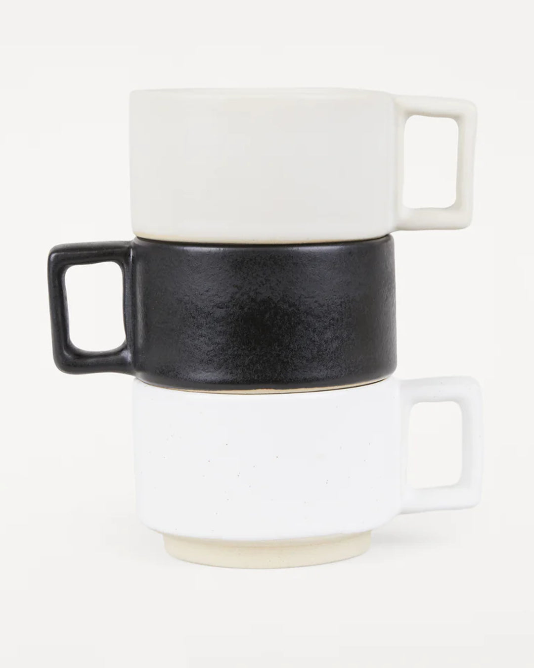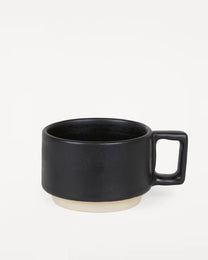 The Otto Ceramic Mug with Handle is made in Europe by ceramicists using delicate, custom glazes. Stackable and composed of timeless shapes, this stoneware mug with a matte black glaze is ideal for serving hot or cold beverages.