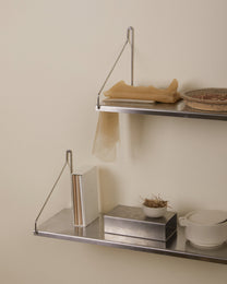 The FRAMA Shelf is a reinterpretation of the traditional Scandinavian shelf design from the fifties. Constructed from solid stainless steel and defined by a sharp yet graceful silhouette, our single shelves can be used for bedside, kitchen, office, storage, and display. Due to the material’s natural corrosion resistance, the shelves can withstand rough, heavy-use applications both indoor and outdoor.