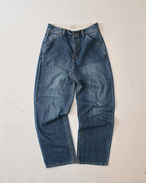 Carter Young's signature bottoms fit has a wide, straight leg and a mid-rise. Made to be worn loose for an easy drape, this pant sits at true waist. Featuring slant pockets at either side of the hip, two back pockets, a zip fly, and a logo shank button. The waistband is faced with contrast fabric to prevent the size stretching.